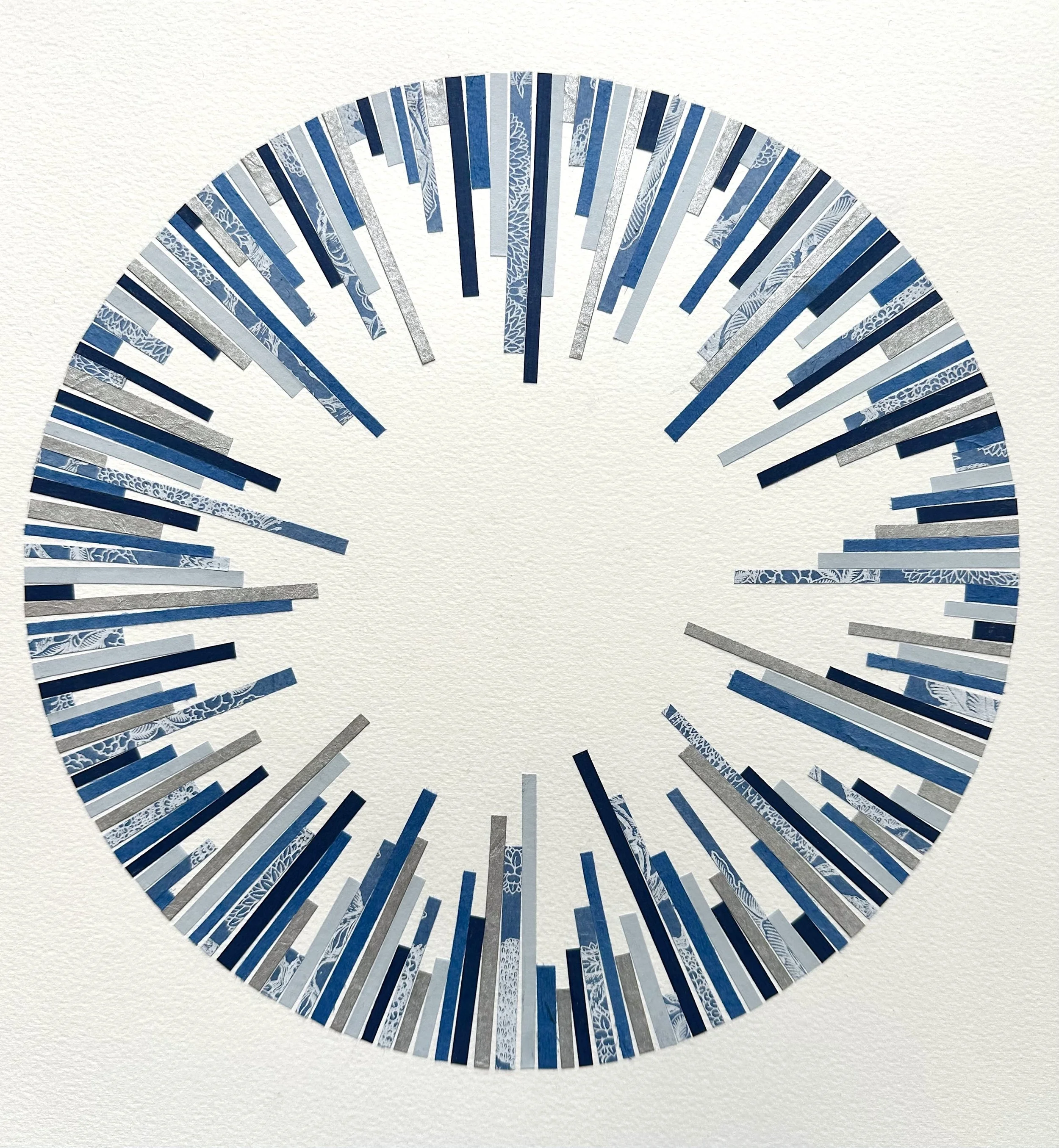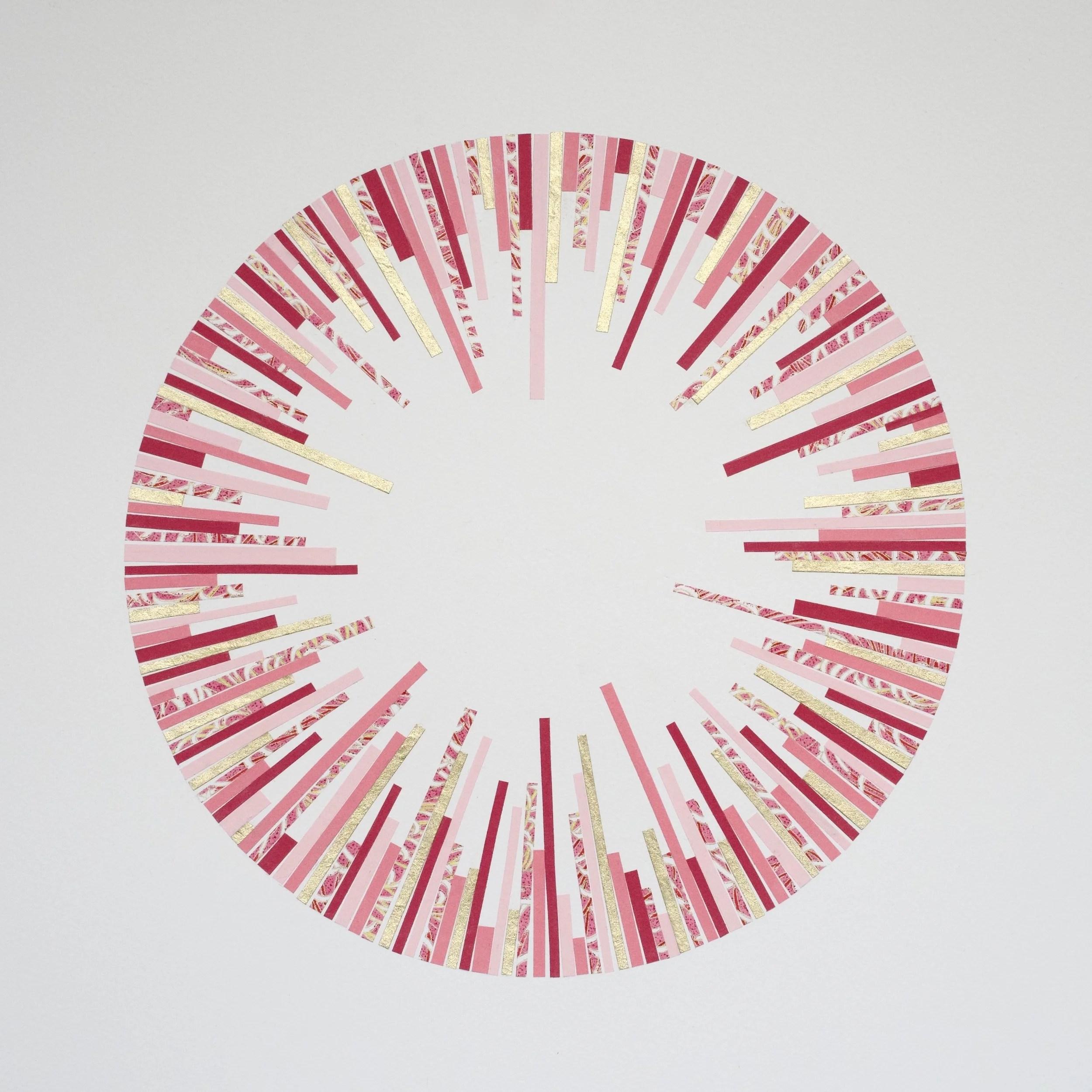 I started working with this series in early 2026. Using the tondo as a structure, geometric lines radiate outward creating a sense of rhythm and movement within a 360 degree field. Each composition plays with different colours and patterns. In some works, strips cut from a vintage atlas are incorporated into the composition, subtly referencing memories of places visited and journeys taken.